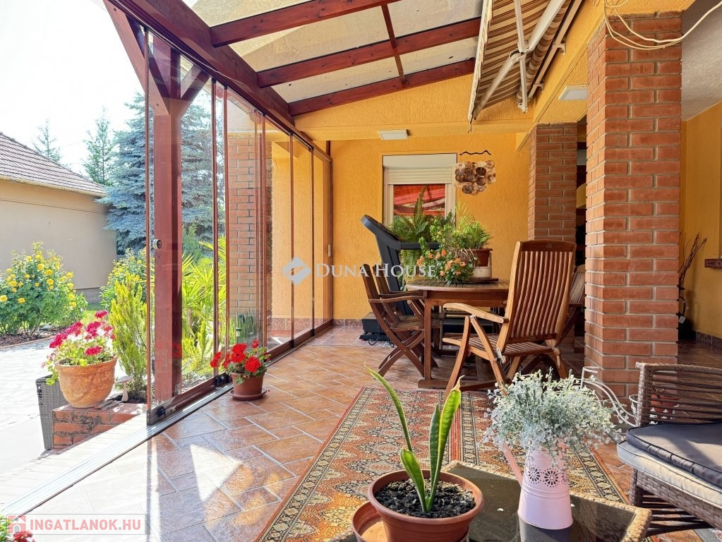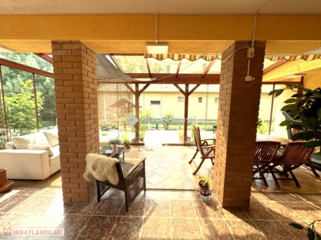 A ház központi részét képező tágas, napfényes télikert különleges atmoszférát teremt, ahová közvetlenül a konyhából és az étkezőből léphet ki.
